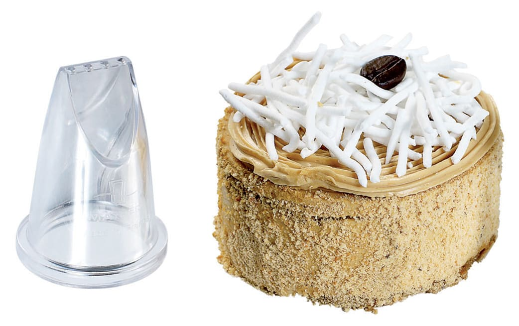 Douille conçue pour la garniture de petits gâteaux (Mont-Blanc et entremets) à partir de crème de marrons, crème au beurre, pour la décoration à base de glace royale.