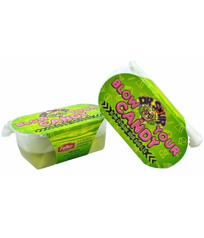 DR SOUR – Bol de bonbon liquide vert gluant et acidulé à la pomme à aspirer avec une paille (X gr) de la marque Dr Sour – Vendu en gros conditionnement dans un présentoir de 12 pcs