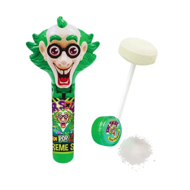 DR SOUR – Sucette Dextrose avec étui Savant Fou à tremper dans une poudre acidulée à la pomme de la marque Dr Sour emballée individuellement sous blister – Vendu en gros conditionnement dans un présentoir de 6 blisters