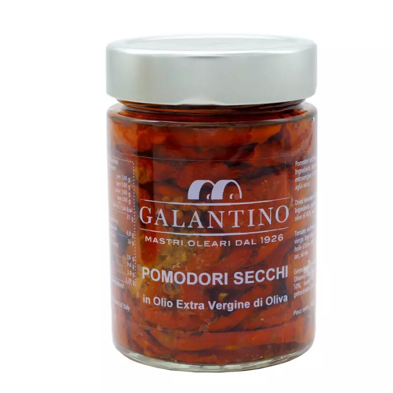 This is a classic Apulian preserve typical of summer. Traditional procedures and particularly careful selection of raw materials make the dried tomatoes in extra virgin olive oil Galantino a specialty to be enjoyed on any occasion.