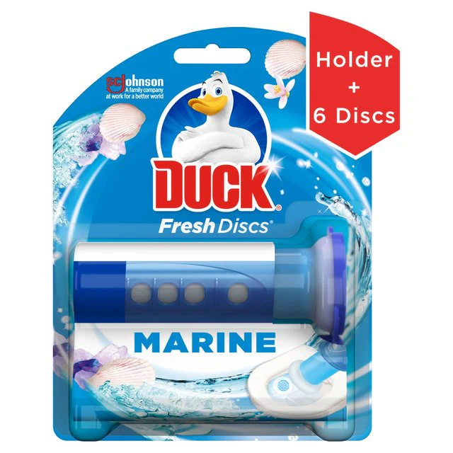 Fretting about traditional toilet cleaner cages that harbour germs? Fret no more. Duck® Fresh Discs Marine have a gel-based toilet stain remover formula that self-sticks to the toilet bowl so germy cages aren’t something to fret about. Fresh Discs prevent the buildup of limescale and germ-harbouring stains. Just stick one to the inside toilet rim, so you can keep things clean with a fresh Marine scent. No touching or scrubbing required, just automatic freshening action with every flush. Pretty easy, huh? This bathroom cleaner starter kit contains 1 handle and 6 gel discs. discs.