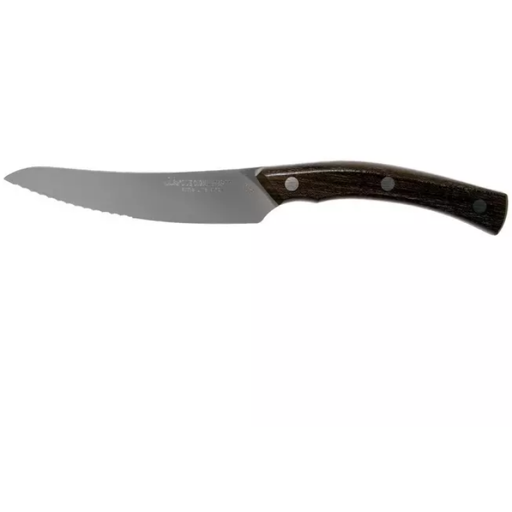Ce couteau à steak dentelé de la ligne Arne de Due Cigni est l’un des couteaux les plus subtils de cette collection. Il n’est pas trop grand, mais ne disparaîtra pas non plus sur la table. La forme remarquable de la lame et le manche incurvé (pour éviter la fatigue) donnent à ce couteau un aspect unique. Pas étonnant étant donné que les couteaux de cette collection ont été conçus par le coutelier danois Jens Ansø. Comme c’est souvent le cas pour les designs Ansø, la perfection et la fonction sont essentielles ! Et vous pouvez dire quand vous regardez le couteau