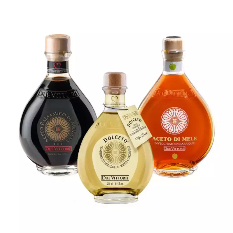 Discover all the colors and flavors of Due Vittorie Vinegar in this trio that combines classic Balsamic Vinegar of Modena IGP Oro, Dolceto white seasoning and barrel-aged apple vinegar.