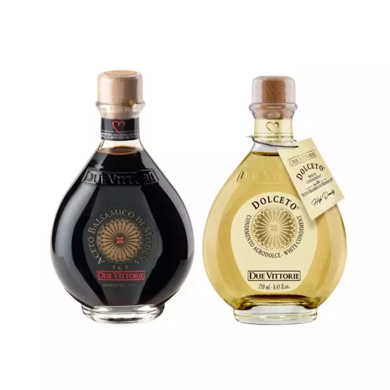 Balsamic Vinegar of Modena IGP Oro and the white condiment Dolceto Due Vittorie for the first time together in this special duet combining two vinegars, one white and one black, very different in flavor and characteristics but both of excellent quality. Try them both in the 250 ml format.