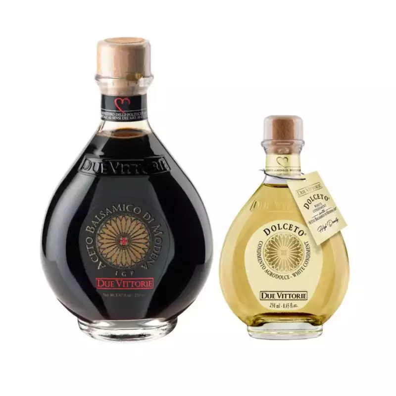 Balsamic Vinegar of Modena IGP Oro and the white condiment Dolceto Due Vittorie for the first time together in this special duet combining two vinegars, one white and one black, very different in flavor and characteristics but both of excellent quality. For lovers of the classic Oro Due Vittorie, we offer this Oro Bianco and Oro Nero set in the 500 ml Oro bottle variant.