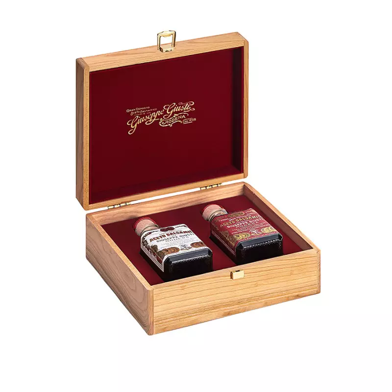 This elegant wooden box contains two great classics of Acetaia Giusti di Modena: Balsamic Vinegar of Modena Two Gold Medals called Il Classico and Balsamic Vinegar of Modena Tre Medaglie Oro, called Riccardo Giusti, from the ancestor of the family Giusti who created the recipe. The first is a fragrant balsamic with great aromatic intensity, while the second is distinguished by its density and sweetness. A unique gift idea for true fans of Balsamic Vinegar of Modena.