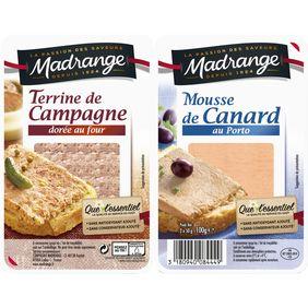 Ingrédients : TERRINE DE CAMPAGNE DE QUALITÉ SUPÉRIEUREIngrédients : Foie de porc, gras de porc, gorge de porc, eau, couenne de porc, farine de blé,oignons, sel, oeufs, arômes naturels, ail, poivre, sucre, ferments, colorant : caramelordinaire. Contient gluten, oeufs. Peut contenir lait et dérivés.MOUSSE DE CANARD DE QUALITÉ SUPÉRIEUREIngrédients : Canard 37% (foie maigre et graisse de canard), gras de porc, foie de poulet,lait demi-écrémé, couenne de porc, saindoux, Porto 1,7%, crème (lait), farine de blé, eau,sel, sucre, arômes naturels, poivre, ferments, colorants : lutéine et extrait de paprika.Contient gluten, lait et dérivés. Peut contenir oeufs.