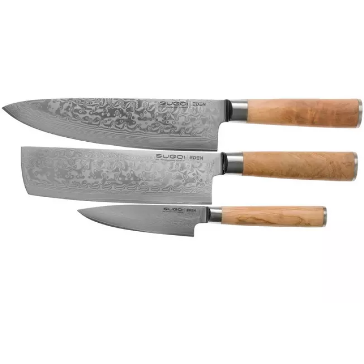 Cet ensemble de couteaux Eden Sugoi Olive est composé de trois couteaux : un couteau de chef, un nakiri et un couteau d’office. En tant que tel, c’est un ensemble de base parfait pour tous ceux qui aiment les couteaux de cuisine japonais.