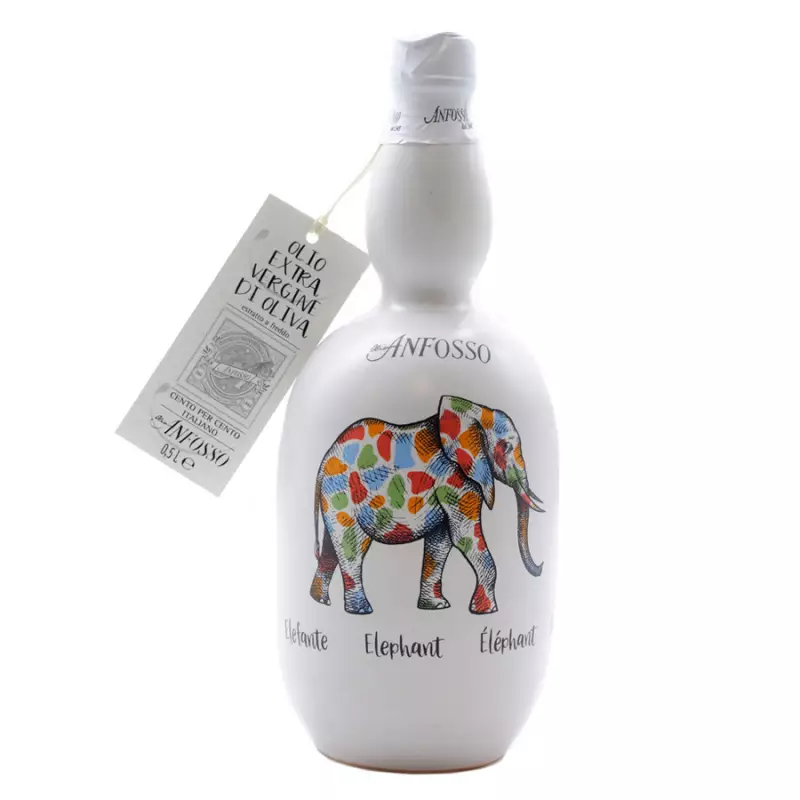 Discover the white ceramic bottle Elephant with Anfosso extra virgin olive oil, a perfect combination of art and Italian culinary tradition. Part of the prestigious collection of handmade ceramics by Anfosso, this bottle is an original gift idea and a refined decorative element for your kitchen and table. Its elegant design, embellished with unique details, combines with the quality of Anfosso EVO oil, cold-pressed from selected Italian cultivars. Its medium-fruity flavour makes it ideal for every culinary preparation.
