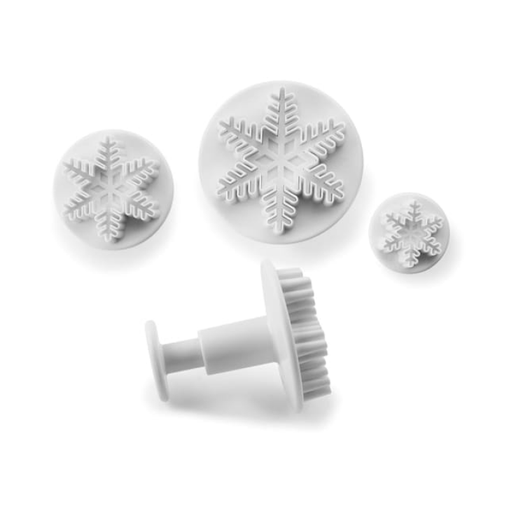 Cet ustensile de décoration très pratique permet dans un premier temps de découper et marquer la pâte en forme de flocon de neige et dans un second temps d’éjecter cette pâte découpée grâce au poussoir.