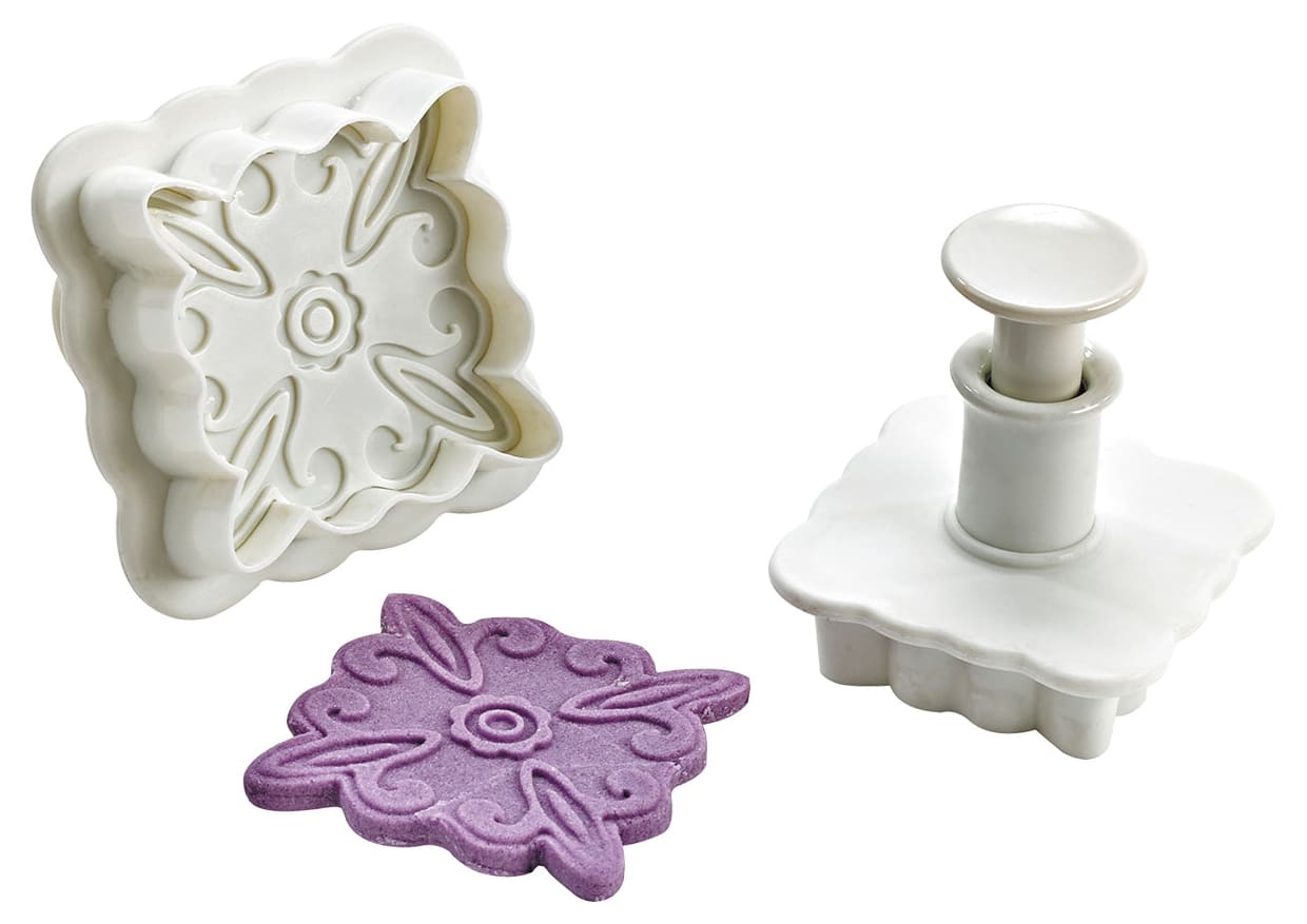 Réalisez d’extraordinaires carrés ornés avec ce groupe de trois découpoirs à poussoir.