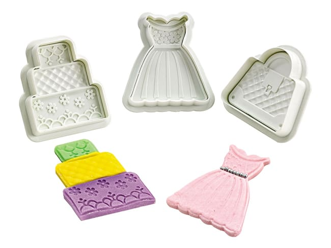Réalisez de fantastiques formes “mode” (cake design, robe, sac) avec ce kit de trois découpoirs à poussoir. Le poussoir permet l’extraction facile de la pâte découpée et en même temps de marquer sur la pâte des motifs en relief.