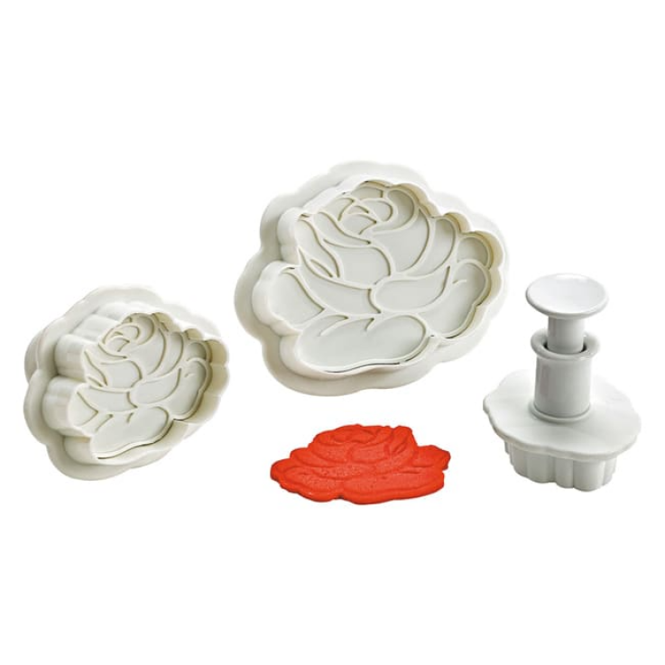 Composez de meveilleuses roses avec ce set de trois découpoirs à poussoir. Le poussoir permet l’extraction facile de la pâte découpée et en même temps de marquer sur la pâte des motifs en relief.