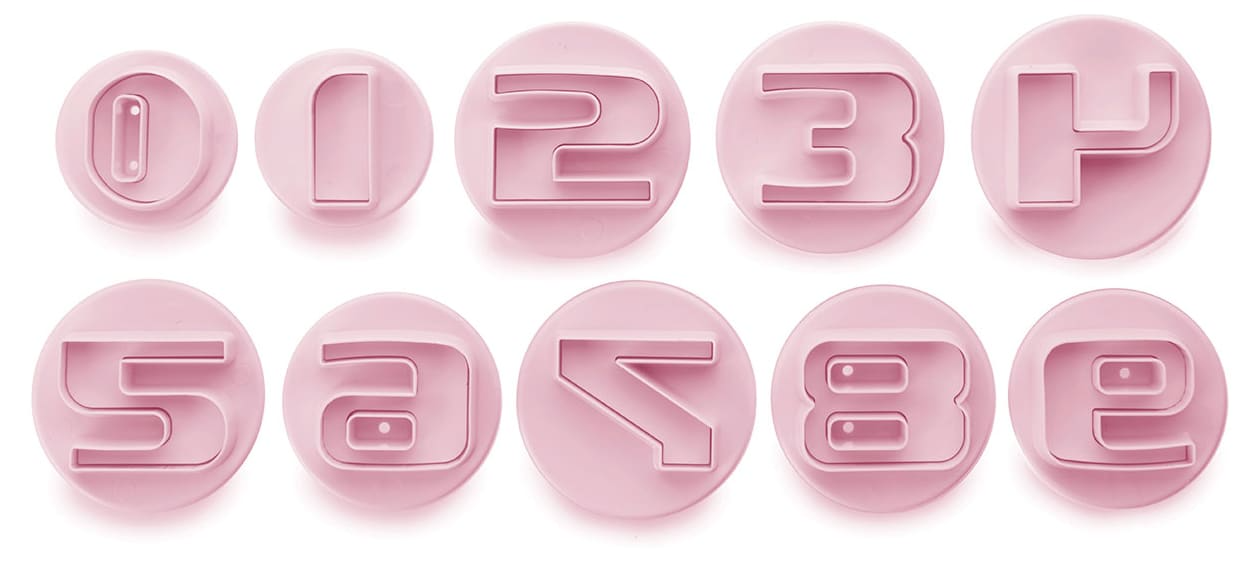 Set de 10 emporte-pièces avec poussoir représentant tous les chiffres. Permet de découper votre pâte à biscuits avant cuisson. Idéal pour la pâte à sucre.