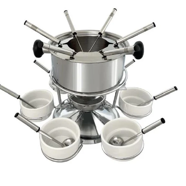 En acier inoxydable de haute qualité, l’ensemble comprend une marmite, 6 fourchettes et 6 cuillères et coupelles à sauce et à condiments en céramique. Le couvercle en acier chromé sert de protection contre les éclaboussures, et de support pratique pour les fourchettes. Fonctionne avec le réchaud et le brûleur intégrés.