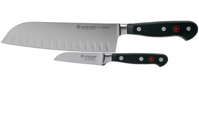 Cet ensemble de 2 couteaux Wüsthof Classic se compose d’un santoku à alvéoles et d’un couteau d’office. Un santoku est la version japonaise du couteau du chef. Il est idéal pour couper des légumes, de la viande et du poisson. Les fossettes de la lame garantissent que les ingrédients ne collent pas à la lame. Le Santoku de 17 cm est idéal pour les tâches les plus exigeantes. Vous avez des travaux plus précis à réaliser ? Utilisez le couteau d’office de 8 cm. Ces deux couteaux sont une excellente base pour chaque cuisine.
