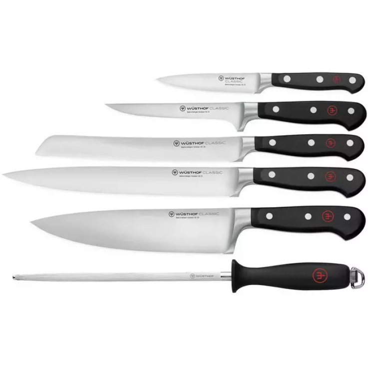 Avec cet ensemble de 6 couteaux Wüsthof, vous disposez de tous les outils dont vous avez besoin pour vous lancer rapidement dans la cuisine. Un grand couteau de chef pour toutes les grandes tâches, un couteau à découper pour couper la viande sans la déchirer, un couteau à pain pour couper le pain et les légumes durs, un couteau à fileter pour fileter une pièce de viande et un couteau d’office pour toutes les autres tâches. Avec l’acier à aiguiser, vous vous assurez que les couteaux restent bien aiguisés ! Cet ensemble n’est pas livré avec un bloc de couteaux.