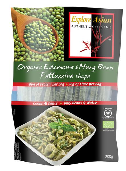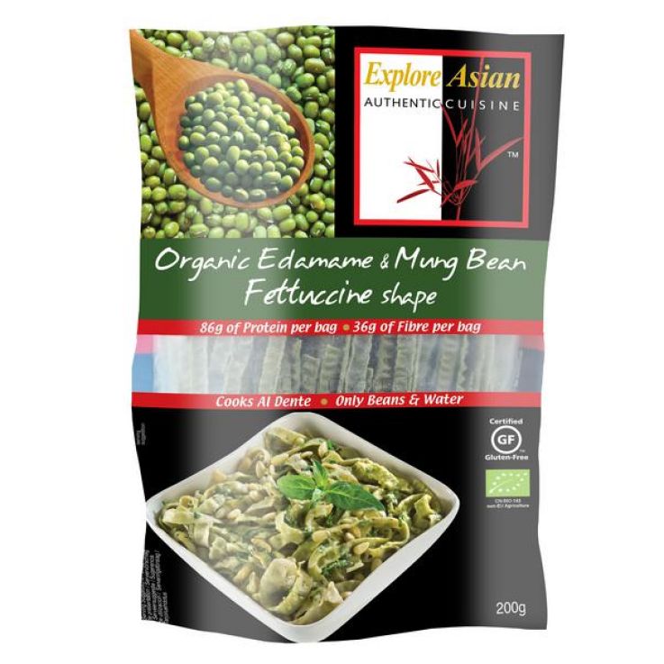 Explore Asian Organic Edamame and Mung Bean Fettuccine contains all the power and nutrition of edamame and mung beans, with the great al dente taste of pasta. Made from organic edamame soya beans, mung bean and water, Edamame and Mung Bean Fettuccine doesn’t ever overcook like many gluten free pastas.