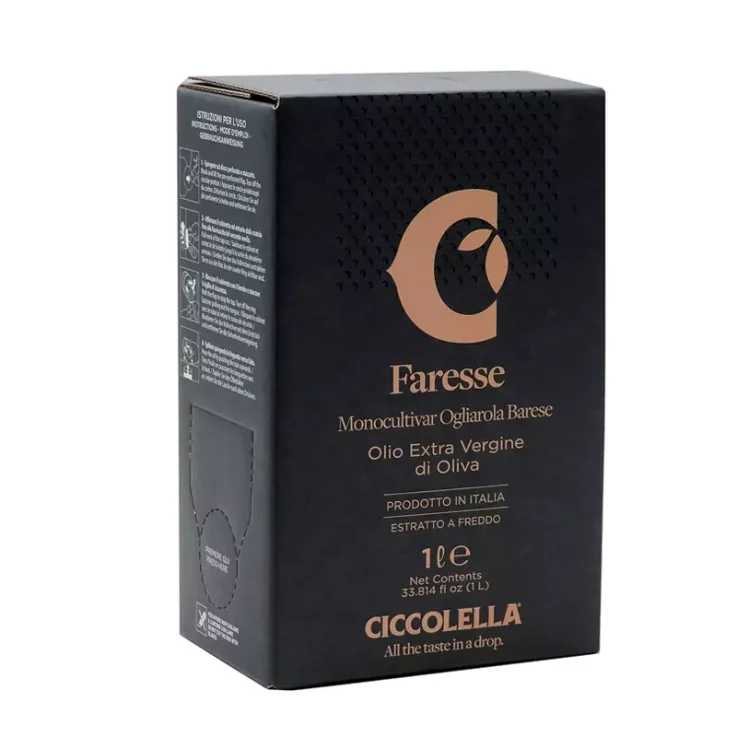 Faresse Extra Virgin Olive Oil by Ciccolella in 1 lt Bag in Box is a monocultivar olive oil obtained exclusively from olives of the Ogliarola Barese variety. The result is an olive oil with a delicate fruity taste, with aromas reminiscent of almond, banana and yellow apple. Perfect for cooking and seasoning tomate-based sauces, fish, fresh legumes, grilled vegetables and salads. Try it in the practical and compact 1 liter Bag in Box. It protects the product from light and thanks to the removable cap you will always have your favorite oil ready to use.