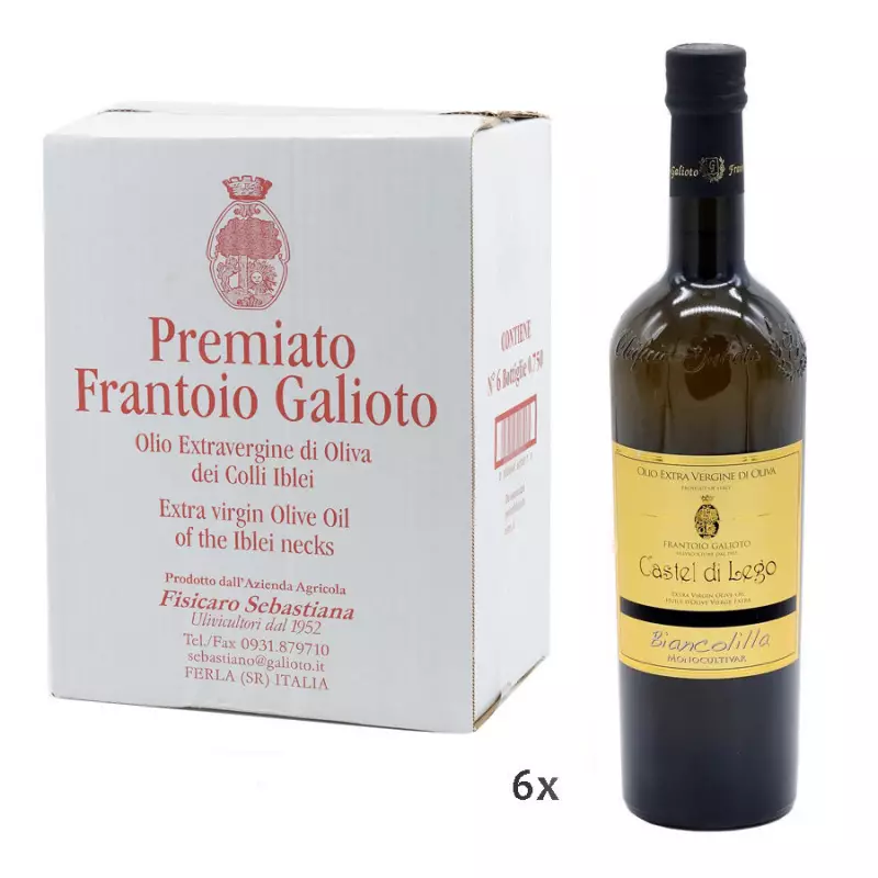 Frantoioio Galioto’s Extra Virgin Olive Oil Monocultivar Biancolilla Castel di Lego is available in a convenient maxi pack of 6 bottles of 750 ml each. This oil with its sweet and delicately fruity flavour is produced exclusively from olives of the Biancolilla variety. The olives are harvested in October and the oil is cold pressed using a modern two-stage continuous cycle. Take advantage of our money-saving package and bring a superior quality oil to your table.