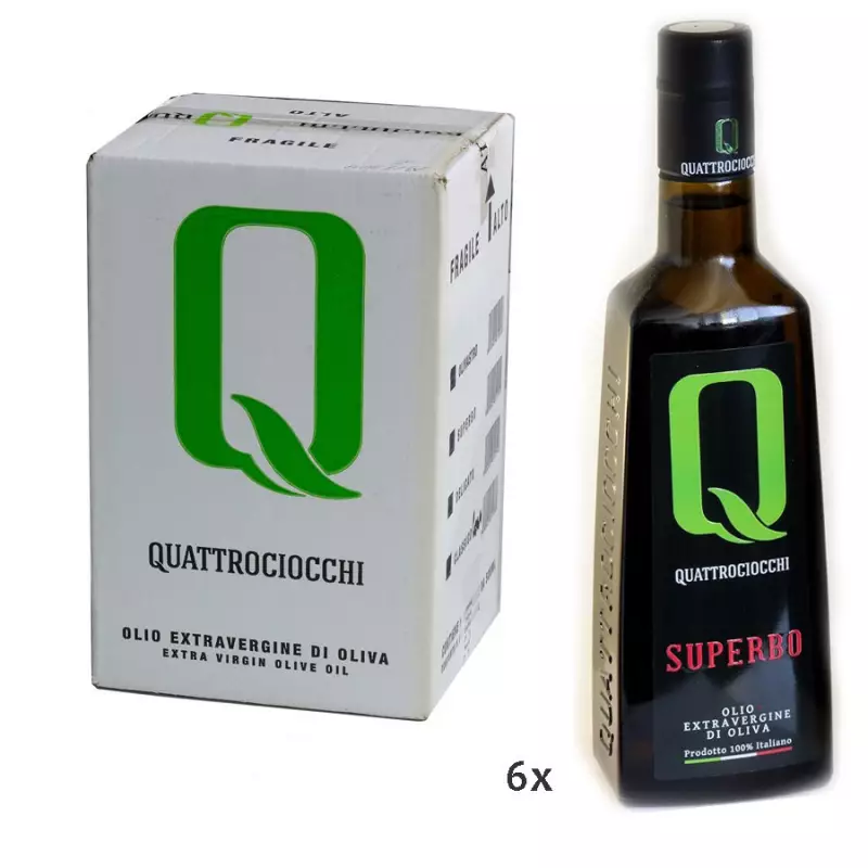Superbo Quattrociocchi extra virgin olive oil in a 6-bottle pack, produced by the Quattrociocchi oil mill in Alatri, is a high quality oil, winner of numerous awards and recognitions both in Italy and abroad. Obtained from the cold pressing of mainly Moraiolo olives, it offers a decisive and enveloping taste. Buy it here also in the convenience format of 6 bottles of 500 ml, so you won’t run out!