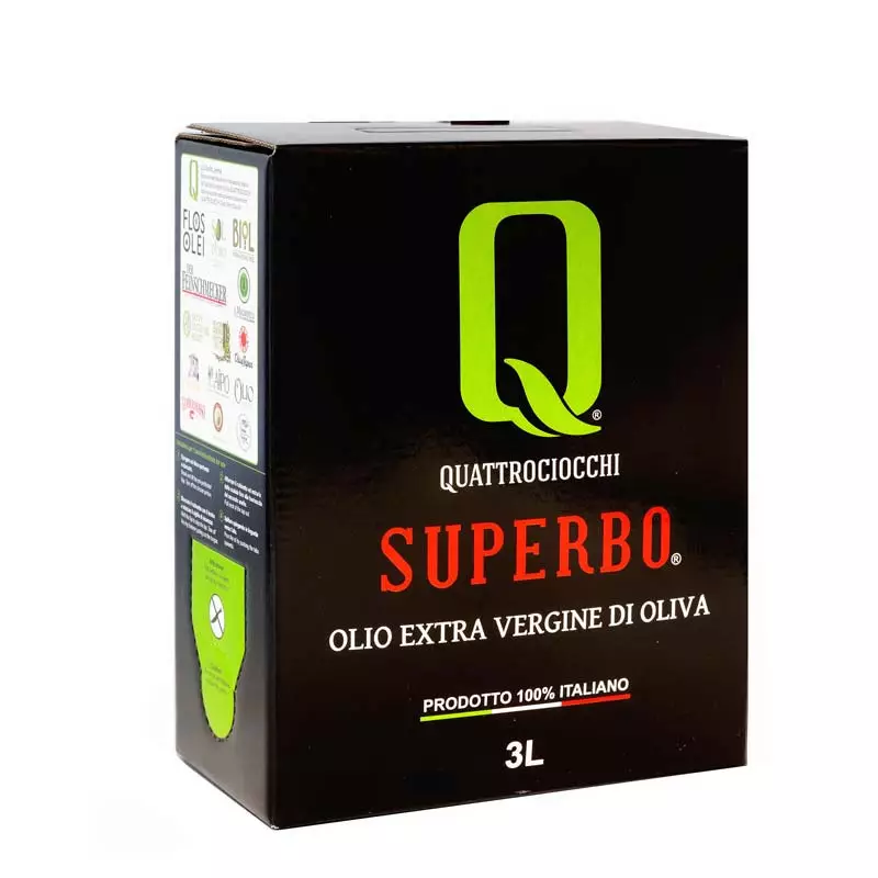 Discover Superbo Quattrociocchi extra virgin olive oil in a 3 litre bag-in-box, an excellence produced by the Quattrociocchi oil mill in Alatri. This high quality extra virgin is obtained from the cold pressing of olives mainly of the Moraiolo variety, which give the product a strong and enveloping flavour. Discover the pleasure of this fine oil, which, thanks to the practical Bag in Box equipped with a removable side tap, protects the product from light and air, guaranteeing maximum freshness.