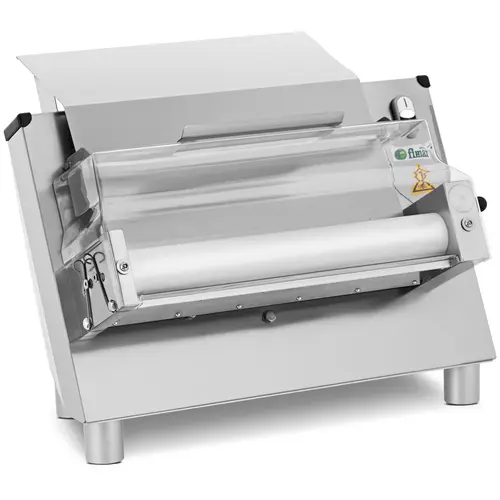 La façonneuse à pizza ici proposée bénéficie d’une longue durée de vie grâce à son boitier en acier inoxydable de qualité. En plus d’être durable, l’inox est facile à entretenir et hautement hygiénique. Les rouleaux qui équipent l’appareil sont quant à eux en polyacétal (POM), un matériau thermoplastique qui n’a rien à envier à l’inox en du point de vue de l’hygiène. Ce laminoir à pâte électrique dispose en outre d’un mécanisme de sécurité efficace : il ne peut pas être mis en marche tant que le capot au-dessus des rouleaux du haut n’a pas été rabattu.