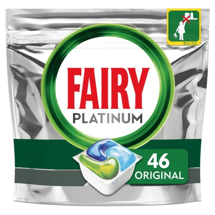 Fairy Platinum All in One dishwasher tablets deliver 1st time cleaning action and tackle even the tough cleaning challenges to get your dishes sparkly clean. Fairy Platinum has the cleaning power that gives you the confidence to cook anything you like, knowing it even takes care of your greasy filter for clean dishes and a fresh dishwasher. Fairy combines liquid and powder in one powerful capsule. Its ultra soluble pouch dissolves fast, so it starts cleaning quickly to get the job done. And they are so easy to use! No unwrapping needed, just place them in your dishwasher detergent dispenser. Fairy Platinum dishwasher tablets tackle tough cleaning challenges the 1st time, Help prevent grease build-up in your dishwasher and cleans your greasy filter, Built-in salt and rinse aid action, including glass and silver protection, Keeps your dishwasher smelling clean and fresh, The ultra soluble tablet dissolves fast
