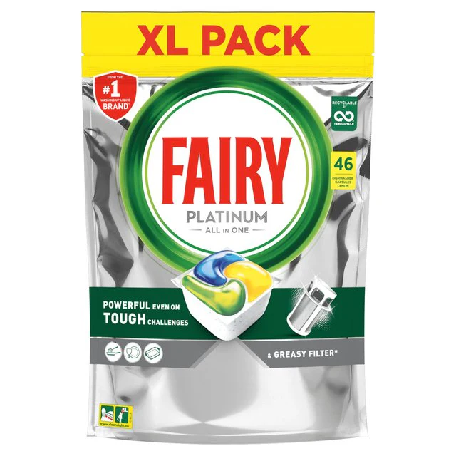 Fairy Platinum all in one dishwasher tablets have the first time cleaning action and its formula cuts through the toughest cleaning challenges to get your dishes sparkling. Fairy Platinum has the cleaning power that gives you the confidence to cook anything you like, knowing it can even clean your greasy filter for sparkling dishes and a shiny dishwasher. Its ultrasoluble pouch dissolves much faster than hard-pressed tablets, so they start acting immediately to get the job done. Plus, they’re incredibly easy to use. Just place them in your dishwasher detergent dispenser. No unwrapping and no mess. Recommended tablet by Hotpoint and Whirlpool global dishwasher manufacturers. Fairy Platinum for tough cleaning challenges 1st time, Fairy Platinum All in One dishwasher tablets, Even cleans your greasy filter against limescale use machine cleaner, Built-in salt and rinse aid action also with glass and silver protection, Keeps your dishwasher smelling clean and fresh, Helps prevent grease build-up on the drainage system, filters and spray arm, Designed and tested for use on all leading dishwashers, Ready to use and no need to unwrap.
