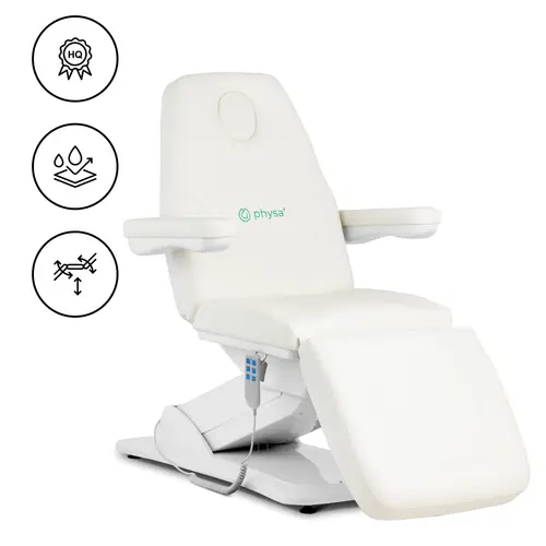 Ce fauteuil esthétique est équipé de nombreuses fonctions pour plus de confort et d’ergonomie. Son moteur puissant permet une manipulation facile grâce à une télécommande filaire. Vous pouvez donc régler la hauteur entre 600 et 850 mm Ainsi que l’angle du dossier (de 0 à 90°), des accoudoirs (de 0 à 150°) et du repose-pieds (de 0 à 45°) suivant le soin en question et la clientèle.