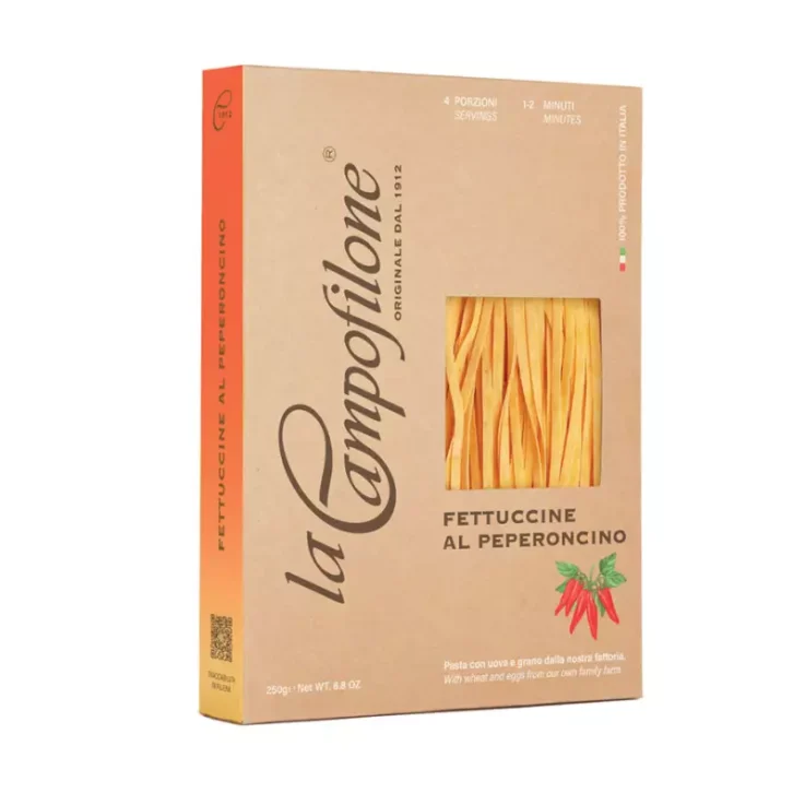 Fettuccine with Chilli from the La Campofilone pasta factory are made from genuine ingredients, with no artificial colours or preservatives. Their spicy and persistent flavour is perfect for those who love strong flavours. They cook in just 1-2 minutes in boiling water and are ideal for about 4 servings. Perfect for adding colour, energy and an irresistible aroma to your dishes, they turn every dish into a unique taste experience. The egg pasta from the La Campofilone agricultural pasta factory is the result of a short and sustainable supply chain as only fresh eggs from hens raised on the land using non-intensive methods and wheat grown on 150 hectares of local land are used.