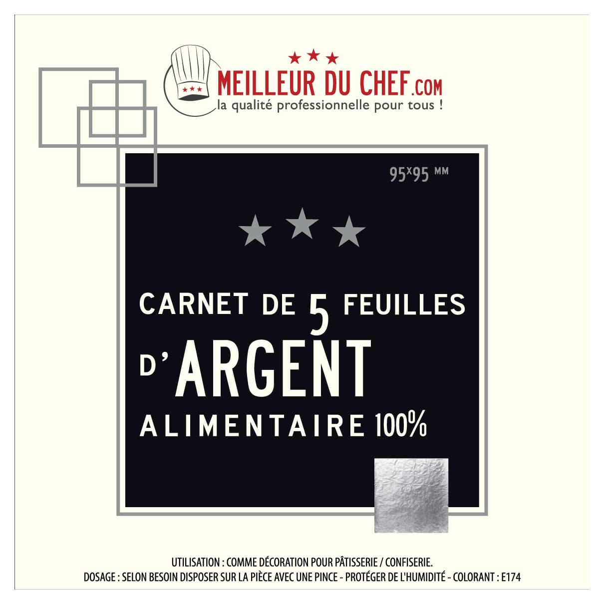 Feuilles d’argent en carnet répondant aux exigences des additifs et colorants alimentaires selon les directives européennes en vigueur.