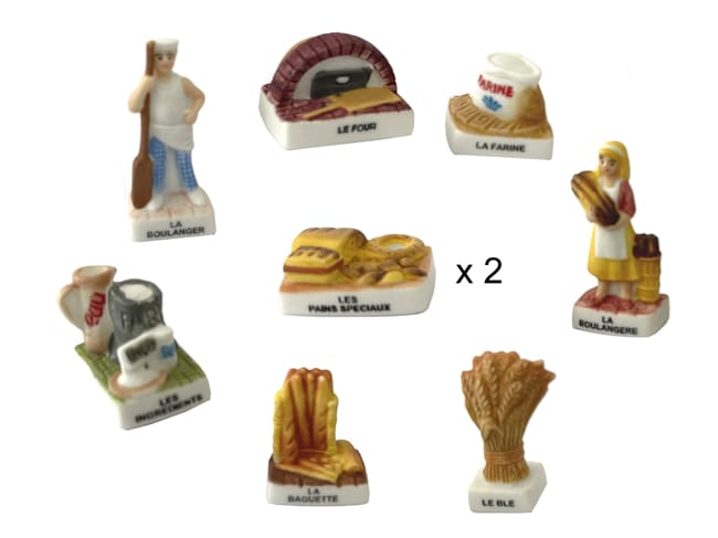 Fèves en céramique représentant le thème de la fabrication du pain.