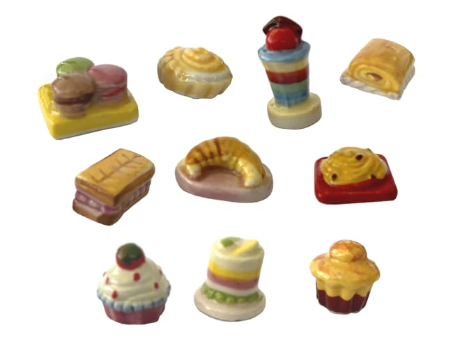 Fèves en céramique représentant le thème des gourmandises en pâtisserie. Disponibilité Septembre 2022