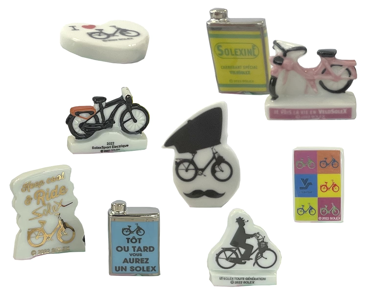 Boite de 100 fèves assorties en cĂ©ramique sur les thème des “Solex d’hier et d’aujourd’hui”. Finition brillante.