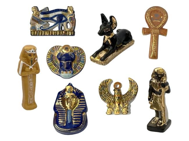 Lot de 10 fèves assorties en cĂ©ramique “Toutankhamon & pharaons”. Finition brillante. UtilisĂ©es pour garnir la traditionnelle galette ou gâteau des rois pour l’Ă©piphanie.