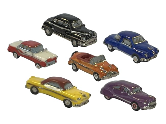 Boite de 100 fèves assorties en cĂ©ramique reprĂ©sentant des “Voitures vintages”. Finition brillante et chromes.