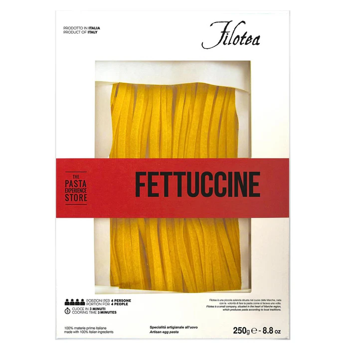 Filotea Fettuccine is a 1cm wide pasta, delicious with meat and fish sauces. Filotea produces dry eggpasta in the Mache region (central Italy), using the finest raw materials and following a unique recipe and artisan preparation methods. The result is an egg pasta that is reminiscent of homemade one, traditionally prepared by grandmothers. It is light and easy to digest, while its textured surface helps to absorb the sauces thus exalting the flavor of all ingredients. Filotea is regarded as one of the Top Italian Food & Beverage Experience by the leading Gambero Rosso guide.