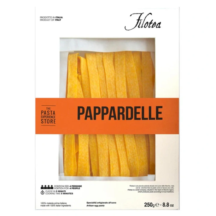 Filotea Pappardelle are the widest cut we produce, excellent with game sauces. Filotea produces dry egg pasta in the March region (central Italy), using the finest raw materials and following a unique recipe and artisan preparation methods. The result is an egg pasta that is reminiscent of a homemade one, traditionally prepared by grandmothers. It is light and east to digest, while its textured surface helps to absorb the sauces, thus exalting the flavor of all the ingredients. Filotea is regarded as one of the ‘Top Italian Food & Beverage Experience’ by the leading Gambero Rosso guide.
