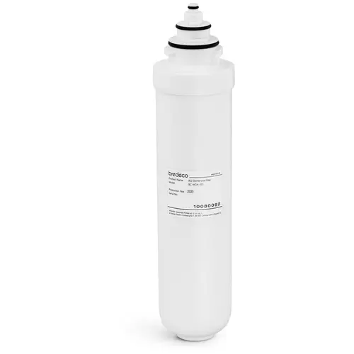 Cette cartouche contient un filtre à membrane fonctionnant selon le principe de l’osmose inverse. Elle purifie l’eau en captant les particules de métal, les pesticides, les virus et les bactéries de 0,0001 µm et plus qui s’y trouvent. Son filtre composé de couches successives de membrane à pores fins permet uniquement le passage des molécules d‘eau et piège la plupart des impuretés sans déminéraliser le liquide. Il vous fournit ainsi une eau osmosée riche en minéraux et en oligo-éléments.