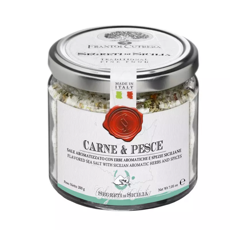 Segreti di Sicilia sea salt for meat and fish is flavored with aromatic herbs and typically Sicilian spices such as oregano, thyme, rosemary and also chilli pepper and dried lemon peels. This aromatic herb salt is perfect for enhancing the flavors of your grilled meat and fish.