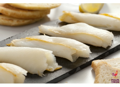 Flétan du Groenland sélectionné avec soin, salé à la main au sel sec et fumé au bois de hêtre.