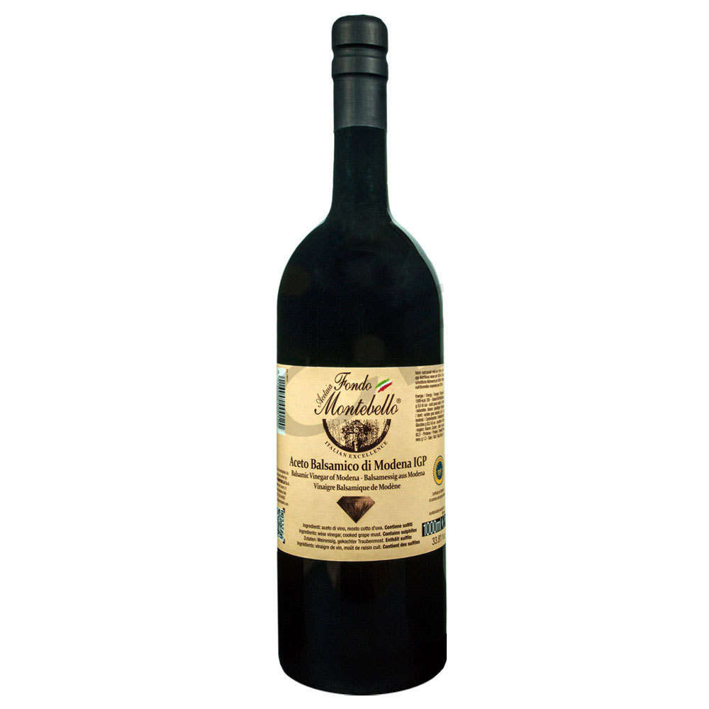 Vinaigre balsamique de Modène IGP. Vinaigre balsamique d’environ 13 ans “FM 02”  1,0 litre  dans une bouteille en verre –  Fondo Montebello .
