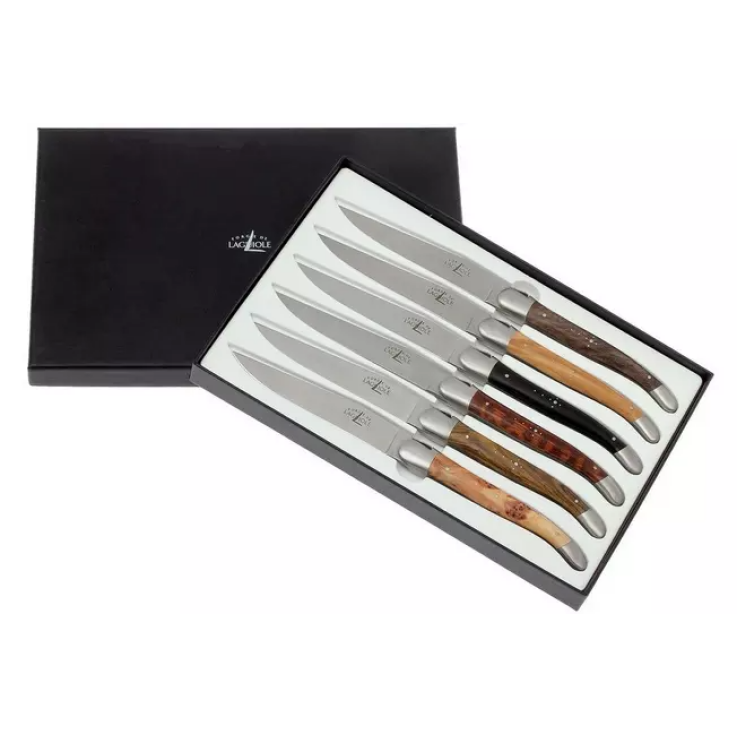 Coffret de six couteaux de table classiques français rehaussés d’une lame fixe. Chaque couteau est rehaussé d’une essence de bois différente. Les différentes essences de bois sont : le noyer, l’olivier, le genévrier, le serpent, l’ébène et le pistachier. Les écailles rayonnent de luxe et sont équipées de la croix de berger caractéristique en forme de sept rivets. Et bien sûr, l’abeille typique de Laguiole se retrouve également sur le dos des lames