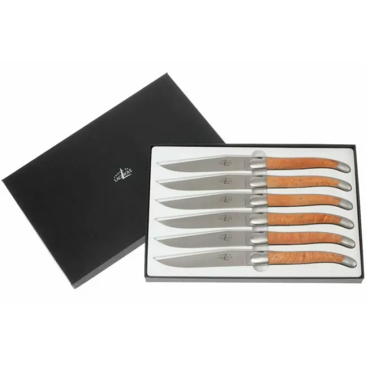 Cet ensemble de couteaux de table Forge de Laguiole est composé de six beaux couteaux faits à la main. La lame tranchante comme un rasoir a un noyau en acier inoxydable français et conserve son tranchant pendant longtemps. Les écailles en bois de bruyère rayonnent de luxe et sont équipées de la croix de berger caractéristique en forme de sept rivets. Et bien sûr, l’abeille typique de Laguiole se retrouve également sur le dos des lames