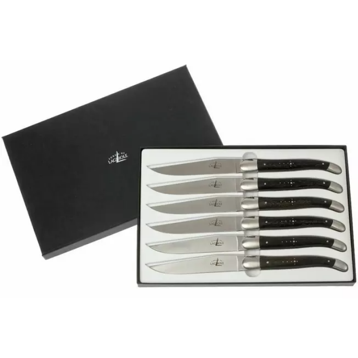 Cet ensemble de couteaux de table Forge de Laguiole est composé de six beaux couteaux faits à la main. La lame tranchante comme un rasoir a un noyau en acier inoxydable français et conserve son tranchant pendant longtemps. Les plaquettes en bois d’ébène rayonnent de luxe et sont équipées de la croix de berger caractéristique en forme de sept rivets. Et bien sûr, l’abeille typique de Laguiole se retrouve également sur le dos des lames.
