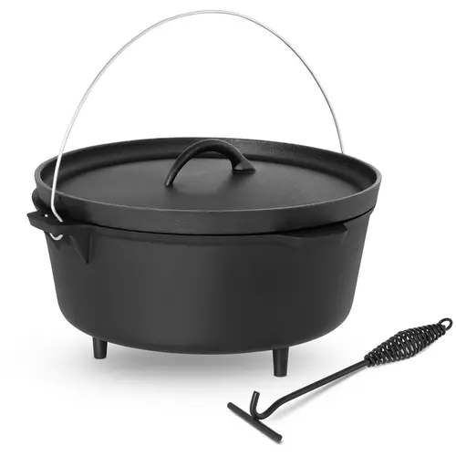 Le four hollandais RCPP-12QTH de Royal Catering est un ustensile de cuisine polyvalent et intemporel livré avec couvercle et lève-couvercle. Grâce à ce faitout massif en fonte, il est possible de faire cuire uniformément et sans maux de tête les plats les plus variés, puis de les maintenir longtemps au chaud. Mais ce n’est pas tout : cet ustensile peut même être utilisé pour la friture. Il est doté de trois pieds solides, idéaux pour le positionnement sur les braises chaudes. Le four hollandais avec couvercle et lève-couvercle se caractérise par une grande polyvalence et constitue l’accessoire idéal pour le camping et les soirées barbecue. De plus, il est tout indiqué pour l’utilisation professionnelle, puisqu’il permet aux restaurateurs de préparer des plats de façon spectaculaire et rustique, ce à quoi contribuent son allure unique, sa qualité et sa solidité élevée. À l’instar de tous les ustensiles de cuisine Royal Catering, ce four hollandais possède une finition parfaite et est fabriqué exclusivement avec des matériaux triés sur le volet.