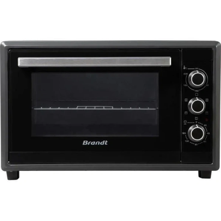 Mini four multifonction noir 55 L Brandt, 2200Watts, 5 modes de cuisson (convection naturelle, multifonction, gril, gril ventilé et sole ventilé), programmes spécifiques, cavité anthi-adhésive, réglable jusqu’à 240°C, minuterie de 120 min, 4 niveaux de gradins, foction tournebroche et fournis avec poignée, tournebroche, 1 leche frite, 1 grille