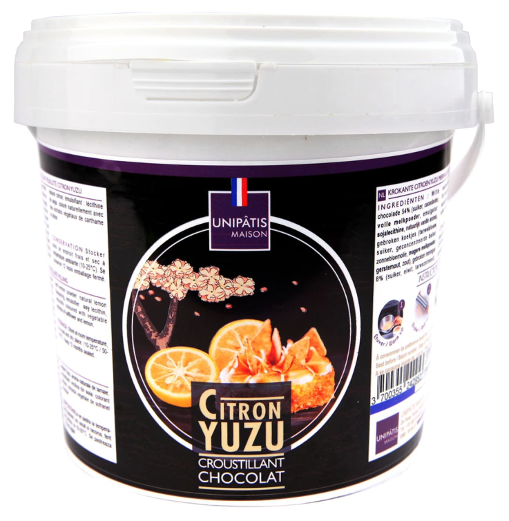 Ce fourrage croustillant au chocolat blanc, citron, yuzu et meringue est une pâte prête à l’emploi pour insert dans un entremets (type Trianon).