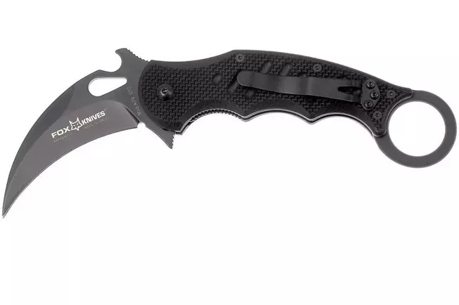 Le Fox Mini Karambit est un karambit pliant compact. La poignée en G10, associée à l’anneau de doigt, offre une prise en main incroyable. La lame en acier N690Co est livrée tranchante comme un rasoir. Pratique, car l’affûtage d’une lame à meuler creuse est toujours délicat. Pour ouvrir ce couteau, vous avez plusieurs options. Vous pouvez utiliser la découpe pour le pouce, le flipper ou la vague Emerson. C’est le crochet à l’arrière de la lame. Vous pouvez l’accrocher à votre poche qui ouvre automatiquement le couteau lorsque vous le sortez de votre poche.